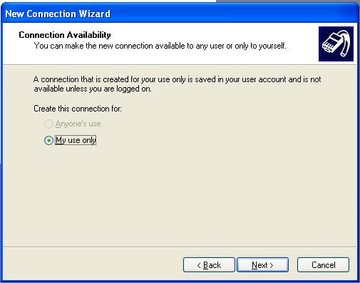 - Choose “Anyone’s use" if you would like anyone using your computer to be able to dial with your user account. Choose “My use only” if you would like to be the only person on your computer to be able to dial. Choose next.