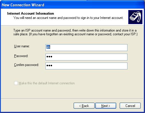 - Type your username into the username box, and your password into both the password and confirm password boxes. Choose next.