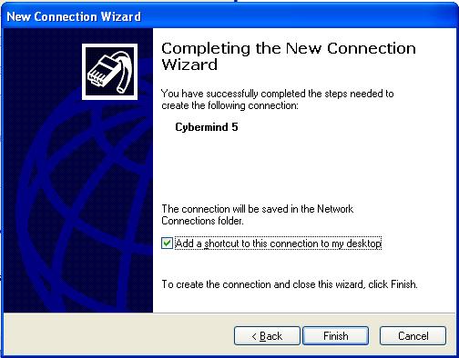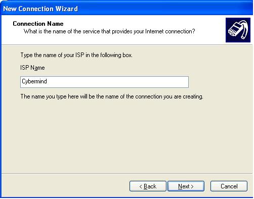 - Type CyberMIND in the ISP name box and choose next.