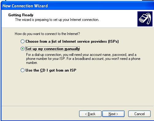 - Choose Set up my connection manually and choose next.